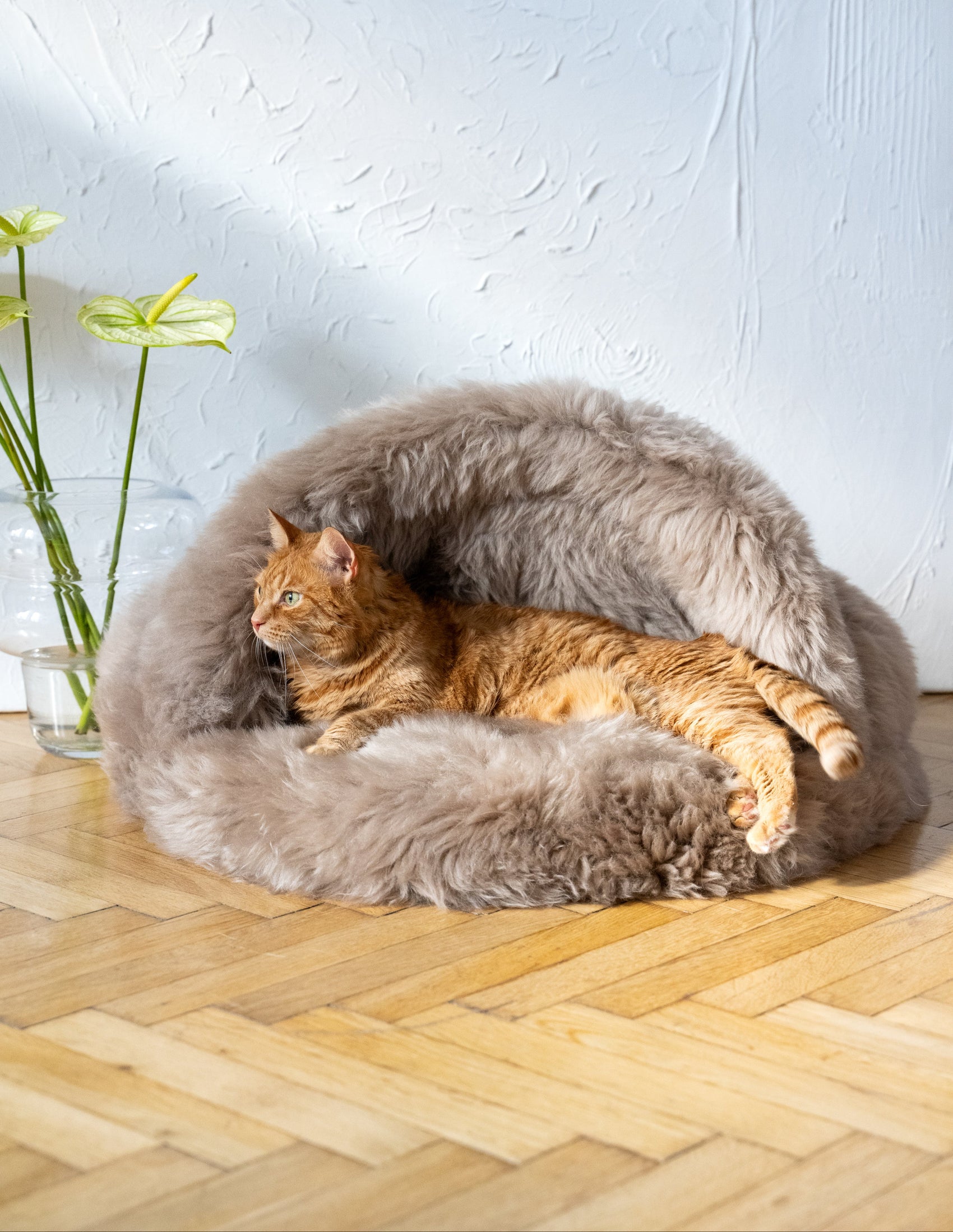 This one’s next-level. A plush sheepskin pouf, fully filled with natural wool and sheepskin scraps from our own studio. It’s more than a bed—it’s sustainable pet furniture that doubles as a statement piece.